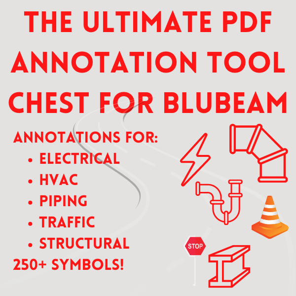Introducing the ultimate PDF annotation toolchest for Bluebeam Revu users! This comprehensive set includes a wide range of annotations specifically designed for traffic, piping, structural, architectural, electrical, and construction professionals. With these tools, you can easily add notes, measurements, callouts, and more to your PDFs, streamlining your workflow and improving communication with your team. Whether you're working on a complex project or just need to make a quick annotation, this toolchest has everything you need to get the job done. Upgrade your Bluebeam Revu experience today with the ultimate annotation toolchest!